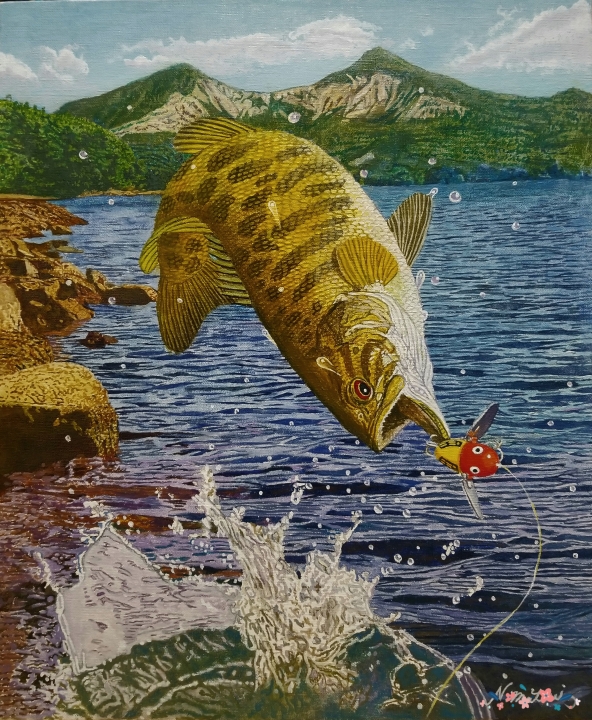 ジャンピングする裏磐梯のスモールマウスバスを描きました。