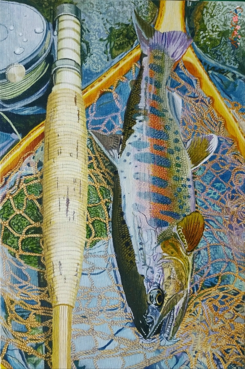 山梨県の忍野桂川で釣れたブラウントラウトを油絵で描きました。
